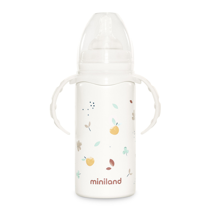 Štýlová termo fľaša Miniland Valencia (240 ml) z kvalitnej nerezovej ocele udrží nápoj teplý až 6 hodín. S úchytmi a netečúcim cumlíkom.